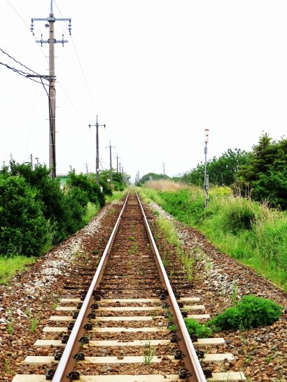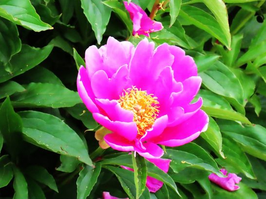 写真、夕刻散歩にて。永遠の単線JR山陰本線、散歩道の下に見えた菜園の隅の花畑。、その中でも鮮やかだった花。牡丹と思ったがネットで葉を調べたら芍薬かも?〔仕事&歩数〕塔社常任理事会向け書類。7,758歩。