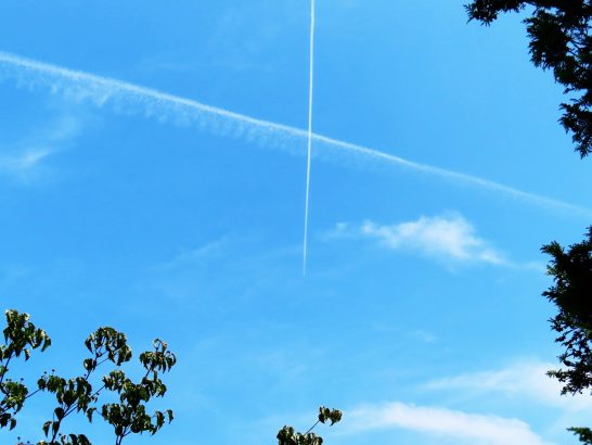 ・本日も琴浦町の最高気温は32℃ほど。昼前散歩では昨日と同じように首筋が暑かったが濡れタオルを忘れてきたので我慢。空には「ガンバレ~~!」と、飛行機雲がクロスしてエールを送ってくれた(写真1)。〔仕事&歩数〕倉吉川柳会・瓦版・川柳塔向けの作句。7,158歩。