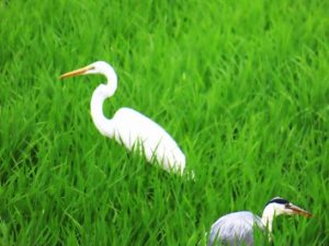 ・本日の天気予報は☀だったが午後からは☁が多くなった。夕刻散歩の田圃道もどんより(写真1)。だが、風が吹くと涼しかった。2、田圃に白鷺のカップル?望遠を効かせて撮っていたら仲良く飛んで逃げた。写真3、昼前散歩の総合公園にて。柿の実が大きくなってきた。4、総合公園駐車場入口の石垣の上にあった人形。駐車場に入るときにチラッと見て「ギョ‼」。車を置いてから写真を撮ったが、ご丁寧に人形の後ろに石を置いて飛ばないようにしている。誰かが落としたか忘れたのだろう。肌も陽に褪せて、目玉も何やら不気味だった。〔仕事&歩数〕塔社向け「せんりゅう飛行船」。7,141歩。