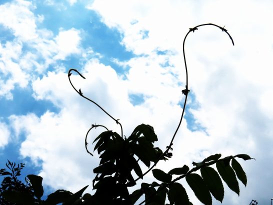 ・写真1~2、本日の昼前散歩にて。農道脇の大きな樹だが、さて何の樹か?分からないほど葛(クズ)の蔓(ツル)で覆われている。敢えて言えば葛の蔓に占領されてしまった「葛の樹」。この葛は繁殖力・増殖力が強く、伸びた蔓が地面に接したところから発根するとのこと。その根を伸ばしても広がり、また種子からも広がるとのこと。