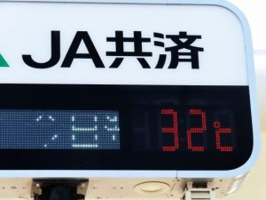 ・本日、鳥取市の最高気温は34℃。琴浦町の最高気温は33℃。午後4時20分頃、夕刻散歩前に農協の電光掲示板を見ると32℃だった(写真3)夕刻散歩では南の方に柔らかな模様の雲(1)。春先からグイグイ伸びた竹が、遮断機のように農道に垂れ下がっていた(2)。〔仕事&歩数〕愛染帖選考&PCインプット。7,440歩。