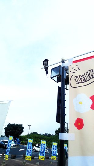 ・【 5日(火)】、拙宅から上六のホテル・アウィーナ駐車場までは、3時間30分もあれば充分だが、ウィークデーの朝は、阪神高速11号池田線が渋滞するので、たっぷり1時間の余裕を持って、5時30分に出発。山陰道~鳥取道~中国道、みんなスイスイ。加西SAにてトイレ休憩。車から降りると、売店の前を小さなツバメが人間など恐れずに低く高くスイスイ。そして、宣伝用幟旗の横ポールの端っこに止まって、得意げに周辺を見回している。それを見てスマホでパチリ(写真2)。