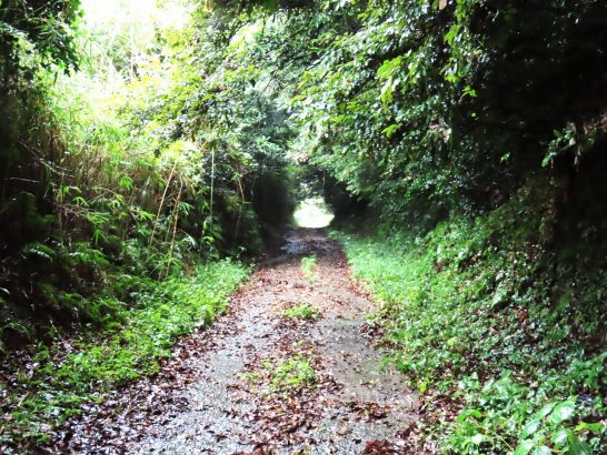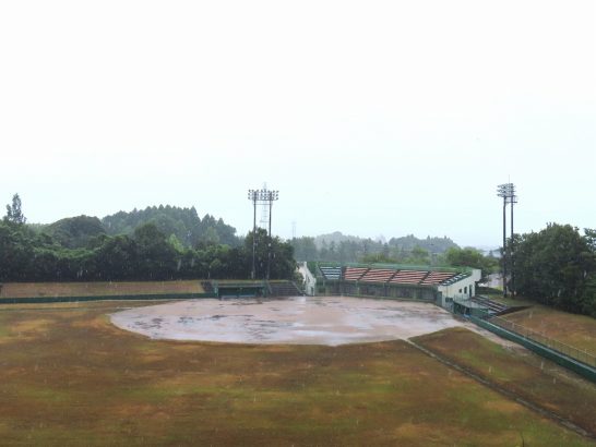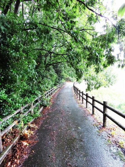 ・本日も朝から降ったり止んだり。昼前散歩も風雨を避ける時に歩いている、いつもの切通し(写真1)。そこから戻って総合公園の遊歩道(2)。そして雨に煙る野球場(3)では水平線も見えなかった。途中から激しくなった雨で、傘を差していてもズボンの膝から下はビッショリ。帰宅後に着替える。