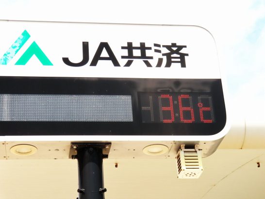 ・昼前散歩に出かける前に、農協の電光掲示板を見ると35℃となっていたのでパチリ。総合公園のグランドでは雲は少しあったが、ガンガン照りで暑かった(写真1)。12時前に帰ってきて見直すと36℃となっていたのでビックリして撮り直し(2)。