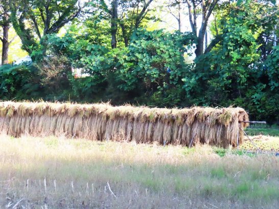 ・写真1は、午後4時半ごろからの夕刻散歩にて。定点観測の農道脇の林。2、3日ぶりに通りがかった総合公園横の田圃では、稲刈りが済んで稲架(ハゼ)(ハサ)に架けられていた。〔仕事&歩数〕しんぶん赤旗「読者の文芸」再チェック後メール&投函。センマガ「川柳杯」選考。5,283歩(昼前散歩出来ず)。