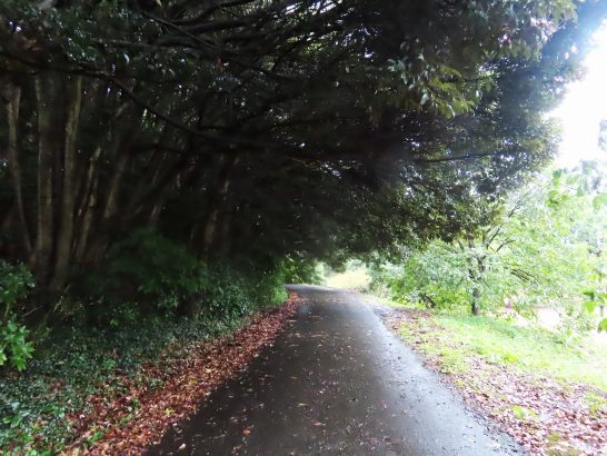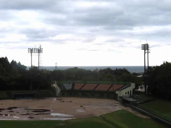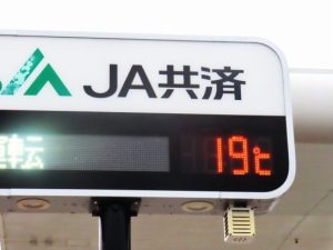 ・本日、朝からずっと雨。昼前散歩の時間帯には強く降っていたのでパス。夕刻散歩の時間には小降りになってきたので、傘を差して、総合公園のいつもの枝が張り出している遊歩道を歩く(写真1)。定点観測の野球場の向こうの水平線は、空の色を写して灰色だった(2)。散歩から帰宅して、農協の電光掲示板を見ると19℃となっていた(3)。散歩中に半袖の腕が「ちょっと涼し過ぎる…」と思ったが、やっぱり20℃を切っていた。 〔仕事&歩数〕塔社「愛染帖」選考後PCインプット。5,837歩。