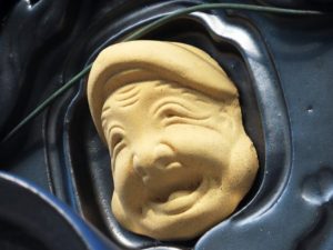 ・今日の昼前散歩は、マーケットへ立ち寄ったついでに、余り歩いたことがない裏通りをぶらぶら。何気なく上の方を見たら、鬼瓦に何かくっ付いている。よく見るとにこやかに笑っている大黒様のようなお顔(写真1~3)。関西では見たことがない。またこちらでもこれまで気がつかなかった。帰宅してからネットで調べたら「出雲地方に多い」と書いてあったが…。町を歩いても鬼瓦までは注意していないので気がつかなかった。