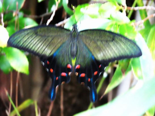 ・夕刻散歩にて。総合公園の遊歩道を歩いていたら、昨日のと種類が違う大きな蝶々が私の周りをヒラヒラ。直ぐ近くに止まったのでパチリ(4)。この蝶の羽は傷んでいなかった。〔仕事&歩数〕大山滝句座の会報作成&発送段取り。4時過ぎに完了したので、郵便局へ持って行こうと思って、フト「祭日か?」と気がついた…(>_<)。7,845歩。