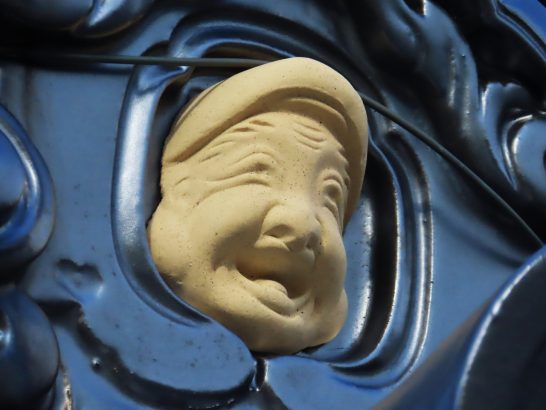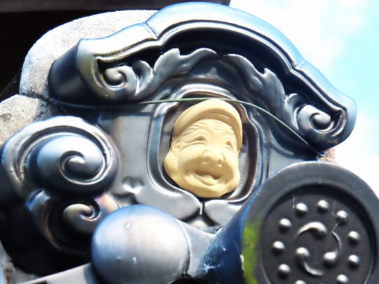 ・今日の昼前散歩は、マーケットへ立ち寄ったついでに、余り歩いたことがない裏通りをぶらぶら。何気なく上の方を見たら、鬼瓦に何かくっ付いている。よく見るとにこやかに笑っている大黒様のようなお顔(写真1~3)。関西では見たことがない。またこちらでもこれまで気がつかなかった。帰宅してからネットで調べたら「出雲地方に多い」と書いてあったが…。町を歩いても鬼瓦までは注意していないので気がつかなかった。
