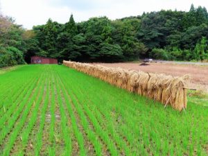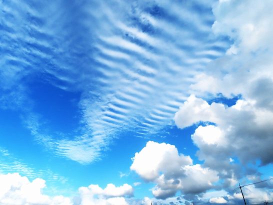 ・本日、ずっと曇天だったが、夕刻散歩のときは青空が広がって、珍しい雲が広がっていた(写真1)。先日、刈り取った稲を稲架に掛けていた田圃。今日の散歩のときに見ると、綺麗に二番穂が出そろっていた(2)。熱帯や亜熱帯では、この二番穂からも親穂の20~50%ほどの収穫があるらしいが、我が国では利用していないのでは? 夕刻散歩からの帰途、彼岸花が咲き揃っていたので車を停めてパチリ(3)〔仕事&歩数〕大山滝句座互選表作成ほか。7,392歩。