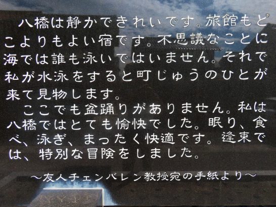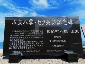 ・好評だったNHKの朝ドラ「あんぱん」が先週で終わって、昨日から「ばけばけ」が始まった。内容はご承知のように、小泉八雲(ラフカディオ・ハーン)と妻セツの物語。舞台は二人が暮らしていた現在の松江市だが、我が琴浦町の八橋(やばせ)海水浴場(写真1)にも遊びに来たことがある(来訪記念碑の写真2・3)。また、民俗学者の小泉 凡(こいずみぼん)さんは、八雲の曾孫で、小泉八雲記念館顧問。上記の記念碑を建立したときにお招きして、記念講演をしていただいて拝聴した。なお、「八雲来訪記念碑 琴浦町」や「小泉八雲」「小泉 凡」など、ネット検索で詳しい情報を得られます。
