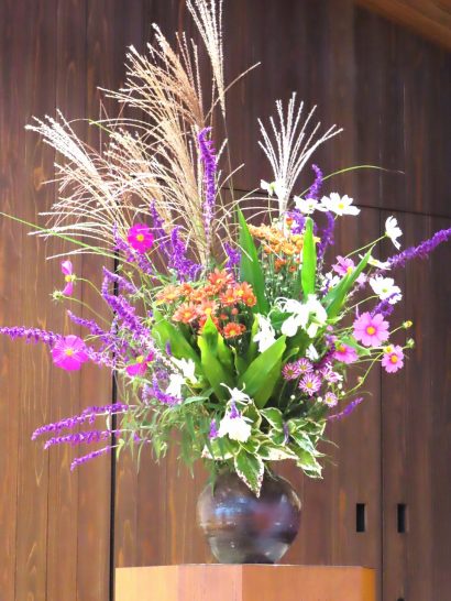 ・12日(日)、朝7時30分にスマホの目覚ましをセットしていたのに、目が覚めたら8時10分過ぎだった。慌てて着替えて1Fのレストランへ行ったら、蘭幸さん、帆子さん、美智子さんが、お揃いで食べておられて「ゴメ~ン!」。やはり疲れていたのかもしれない。朝食後9時出発で久米南町の【西日本大会】会場へ。到着は9時30分頃?すぐに選者室へ案内されて席題を訊いて、当日投句分と併せて出句。10時半頃に「中取り」が来たので選考。10時半から12時半までに選考完了のち昼食。写真3、会場のメインフラワー。