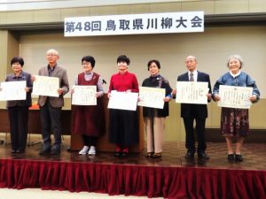 ・開会式直後に【第46回鳥取県川柳作家協会賞(日満賞)】の発表と表彰式。今回の選者は岡山県の藤井智史さんにて、受賞句は下記の通り。不肖私も佳作2で入賞。