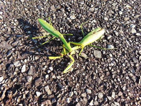 ・本日、朝から爽やかな秋晴れ。写真1は昼前散歩にて。総合公園南方の飛行機雲。気温も昨日より少し上がって快適だった。夕刻散歩で農道を歩いていたら、カマキリが組み合ったままジッとしていた(2)。よく見ると、下敷きになっている方が、体が少し大きいようで、その上に乗っかって、両手でガッチリ抑え込んでいる方は青年の感じ。帰宅してからネットで調べると。カマキリは肉食昆虫なので、空腹のときは仲間を食うときがあるとのこと。もう1つは、交尾したあと、メスがオスを食うことがあるとのこと。食料事情による捕食本能・繁殖戦略など、いろいろ事情があるようだが、写真のものはどちらなのか解らない。〔仕事&歩数〕しんぶん赤旗「読者の文芸」選考。7,798歩。