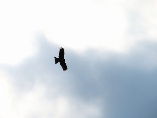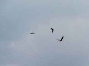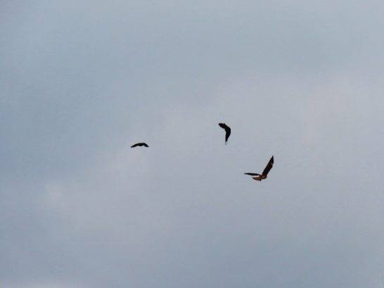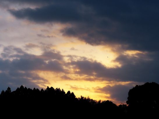・帰宅後、すぐに夕刻散歩にて総合公園へ。遊歩道を歩いていたら、頭上でカアカアーとカラスの大きな声。振り仰ぐと3羽が縺れあうようにグルグル(写真2)。写真を撮ってから「遊んでいるのか?」と見ていると、どうも鳶1羽とカラス2羽が喧嘩しているような感じだったが、すぐにカラス2羽は飛び去って、鳶が悠々と輪を描いていた(3)。それから遊歩道をぐるっと回って駐車場へ戻ってくると西空に夕映え(4)。〔仕事&歩数〕しんぶん赤旗「読者の文芸」選考。7,779歩。