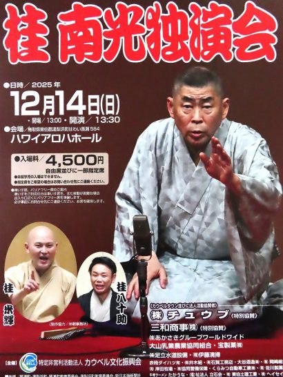 ・本日、早めの昼前散歩と昼食を済ませ、店の入り口に【すみませんが、午後4時まで閉めさせていただきます】と貼り紙をして、12時30分に家内と隣町(湯梨浜町)の「アロハホール」へ【桂南光独演会】(写真1)を聴きに出かける。