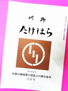 ・今月の8日?、大阪から帰宅したら「たけはら」の12月号が届いていた(写真3)。これは【竹原川柳会第3回誌上大会】の発表誌で、自分の句を確認したら1句だけ抜けていた。翌日にブログでアップしようとしたら、この冊子が見当たらず。「見つかってから…」と思って放置していたら、昨夜、句会用のバッグの底から出てきた。入選句は【 ほろ酔いでポロンと鳴らす駅ピアノ 】課題「楽器」、5人共選の1人に抜けていた。