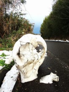 ・鹿野からの帰途に倉吉駅に立ち寄って、7日の大阪主張のチケットを購入。帰宅すると5時前で小雨も降っていたので、夕刻散歩は中止。まだ4,600歩ほどだったので、足踏み体操でようやく5,000歩超え。写真1は昼前散歩にて。農道横の定点観測の藪。畑には残雪あり。2は除雪車が残して行った雪のカタマリが溶けて出来上がった自然のオブジェ。〔仕事&歩数〕鹿野川柳会出席。5,032歩。