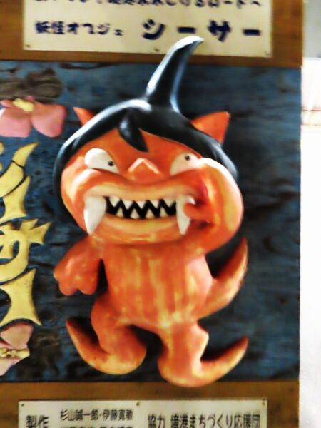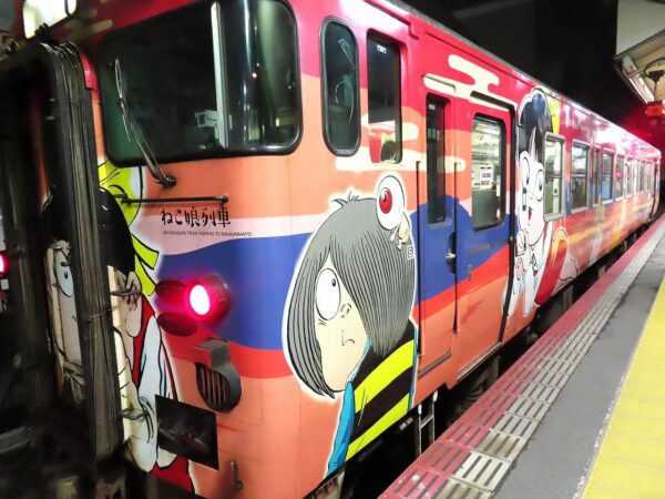 ・終了は午後4時。4時43分発の特急「まつかぜ12号」に乗車。米子駅にて鳥取行き普通列車に乗り換えが、40分ほどの待ち合わせ。退屈なので米子駅をブラブラ。北端のホームは「妖怪ロード」のある境港行き。丁度「ねこ娘列車」が停まっていたのでパチリ(3)。同じホームに「妖怪ロード」にちなんだオブジェがいっぱい。そこから選んで「シーサー」(4)と「しにがみ」(5)。この「しにがみ」がイチバン笑えた(^^)/。ようやく来た「鳥取行き普通列車」に乗ってガタゴト。途中、対抗列車を2度も待って、浦安駅着は午後8時10分過ぎ。江津から実に3時間半近く。江津にはひとかけらの雪も無かったが、浦安駅は折からの吹雪。路面は圧雪。まるで北国に帰ってきたようなムードだった。島根の皆さま、大変お世話になりました。おかげさまで充実した楽しいひとときを過ごすことができました。有り難うございました。お疲れが出ませんように!!〔仕事&歩数〕しまね文芸江フェスタ講演&選考。6,233歩。
