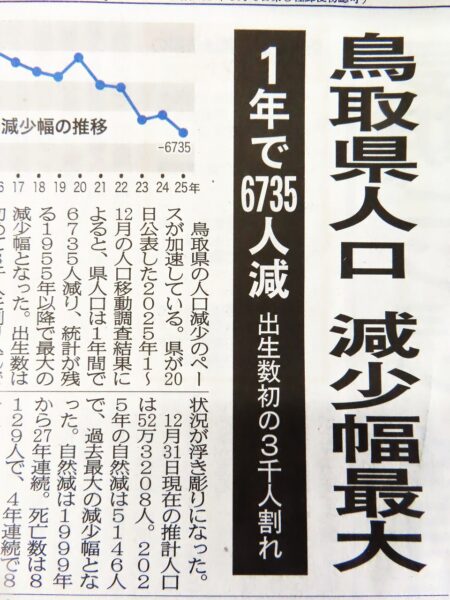 ・今朝の地元紙「日本海新聞」の1面に掲載されていた記事【鳥取県人口 減少幅最大】(写真2)。「鳥取県の人口減少のペースが加速している。」という書き出しで、昨年12月31日の推計人口は52万3208人とのこと。私が鳥取県に移住した1980年には60万人を超えていたので8万人減ったことになる。地方創生などと唱えていても、若者が地方から都会へ出て行く流れは止まらない。刺激が少なく楽しい所が少ない田舎より都会が良いのは当然だろう。大阪では心斎橋や御堂筋や梅地下等々、東京では浅草や銀座や六本木等々「歩くだけで楽しくウキウキする」という、若い心を刺激する所は田舎には無い。
