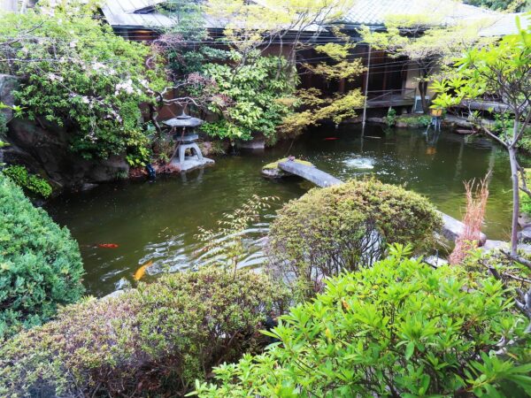 ・12時から、会席膳にて勤務時代の工務課OB会。本来なら「カンパ~イ!」で始めるべきところ、昨年末に亡くなった私と同期のTと、今年の3月12日に急逝した元課長のMさんのご冥福を祈ってビールで「献杯!」。のち、私は芋焼酎の湯割りを頂戴。話題の中心はやはり亡くなったTとM課長のこと。そして、数年前から若くして旅立った仲間たちのこと。M以外にごく親しい仲間だけでも4人。みんな私より年下なので、改めて残念!(2は宴会場横の庭園)