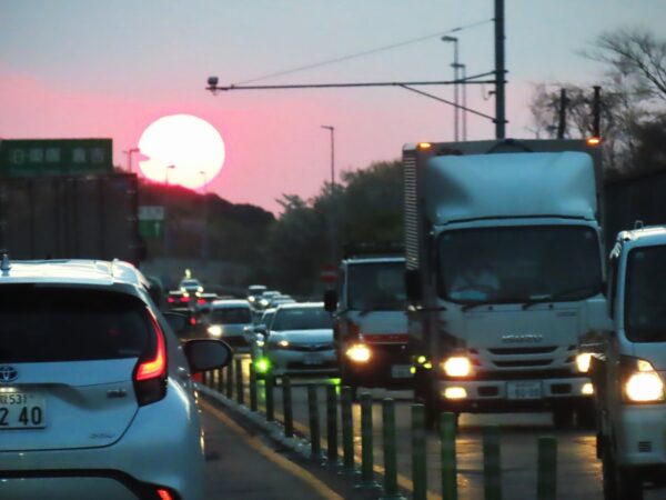 ・終了後、駐車場から車を出したのが、4時10分前。帰路も渋滞なく。加西SAにて小休止。定点観測の「仲良しベンチ」が「晩酌は逃げませんから、慌てずゆっくりね…」と言っていた(3)。帰路もスイスイ、だったが、鳥取道から山陰道に入ってから、会社帰りの時間帯だったのかしばしばスロースロー。だが、帰着は7時10分前。ジャスト3時間だった。写真4は山陰道にて、大きな真っ赤な夕陽(肉眼で見たときは真っ赤だったが、写真をアップすると、このような色になっていた)。〔仕事&歩数〕川柳塔社4月句会出席。6,608歩。