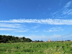 写真上: 昼前の散歩道にて。飛行機雲が長く残っているとき、天気は下り坂と言われているが、天気予報では明日は好天。明後日は下り坂のよう。