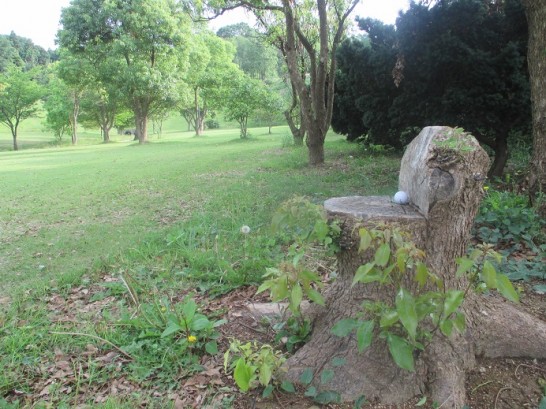 写真下、昨日昼前の散歩にて。久しぶりの「天使の椅子」。誰かが、どういうつもりか、ゴルフボールを置いていた。椅子の周りから、まだヒコバエが出ている。伐り倒されて何年も経つのに凄い生命力である。