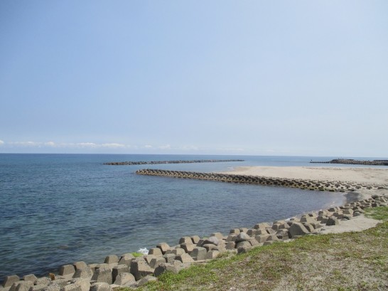 このアジサイ公園の前は日本海。そして、逢束の波止がある。(写真下)撮影したのは、本日、10時30分。「猫の子一匹いない」という比喩があるが、まったくその通り。猫にも犬にも人間にも会わず、とても静かで広々とした空間。海もベタ凪であった。