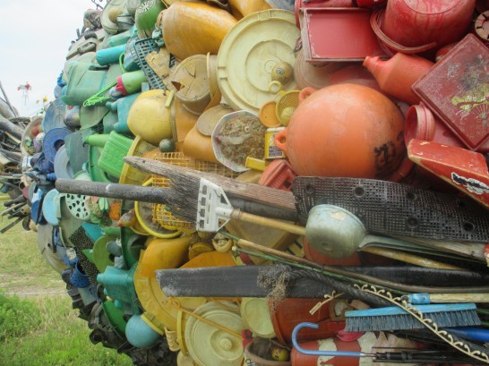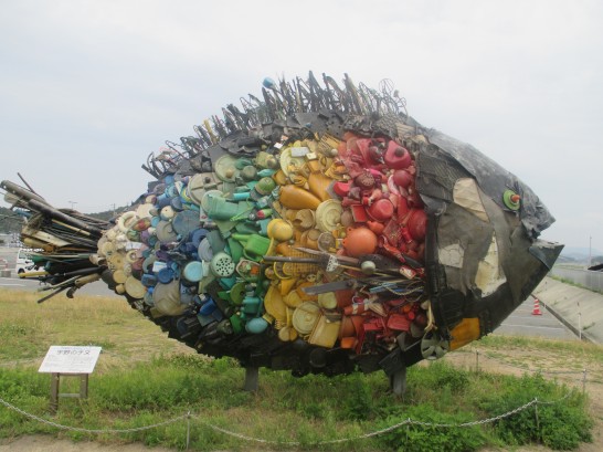 今朝、7時出発。玉野市の会場着は、9時20分。出句後、宇野港方面へ散歩。富山へ出かける直前に痛めた右膝(古傷)が、まだ少し痛むがなんとか、ゆっくり片道20分ほど。下のオブジェは、去年?もご紹介したと思うが、宇野港前の公園にある巨大な魚。左下の説明書には【作品名:宇野のチヌ。 作家名:淀川テクニック。 制作年:2010年7月。 この作品は瀬戸内国際芸術祭2010に出展された】と記されている。細かく見たら(写真下)、海岸に漂着したバケツやウキや帚など、集めたものに色を塗ってあった。