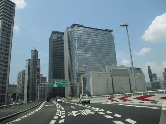 写真下: 阪神高速池田線、中之島の上あたり。帰路11時40分頃。このときは快調に飛ばしていたのだが…。これから遠距離にドライブする人にアドバイス。かならずペットボトルとか水筒の水を持ち込むこと。渋滞のど真ん中に閉じ込められて喉が乾いたら最悪。空腹は我慢できても、水を飲まないと、熱中症や脳梗塞など大事に至ることあり。本日、偶然ペットボトルの水がバッグに入っていて助かった。