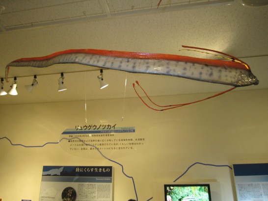 写真下1: 山陰海岸学習館に展示してあった、深海魚「リュウグウノツカイ」の剥製。たまに浜に打ち上げられている。この学習館は、このあたりの山陰海岸が「世界ジオパーク」に認定されたのを記念して建てられた。会場のホールでは海中の様子を紹介する3D映像が美しく面白かった。入館無料ですので、岩美町方面へ行かれる方は是非立ち寄ってください。
