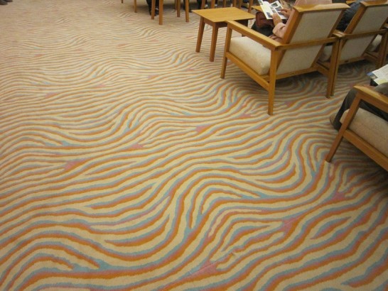 写真1:鳥取県知事公邸の中庭。 写真2:公邸の第1応接室天井の照明。穏やかであたたかな光は、因州和紙(青谷和紙)の効果。 写真3:同応接室の絨毯は、鳥取砂丘の風紋を模したもの。