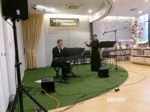 いつもは、家内と一緒に行っていた、図書館のミニコンサート、今日はギターアンサンブルと、キーボードとフルートの二人組の音色を聴かせてもらった。ギターは指の動きが見える位置での鑑賞だったので、コードの指が、規則正しく動くのに対して、メロデーの指が、しなやかに動いていた。ギターの優しい音色は耳に、心地よかった。メンバーは、高齢者ばかりのようであったが、演奏している顔は溌剌、うらやましい限りある。キーボードは主人で、フルートは、奥さん夫婦で、キーボードの力強い伴奏に、フルートが、追っかけて行く音色に、しばらくうっとりさせてもらった。