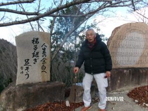 墓には戒名晩の裏には、私の母を詠った句を、献句 半歩先歩けと母の遺言状 の句を刻み、句碑は88か所の縁で懇意になった石屋さんが、弘法大師の5っもある、巨大な像を立て、ミニ88か所を作ったのを機に、少しでも、賑やかにと、無償でで句碑を作っていただいた。今日、この日にの記念に、写真を撮ってもらった。 人生の余白へ梯子継ぎ足そう 70歳で定年退職した時の句である。この句はもともと、下五が、足してみる であったが、私の川柳の師、杉原正吉(故人)の添削によるものである。字は、松永の、高津幸雄(故人)である。
