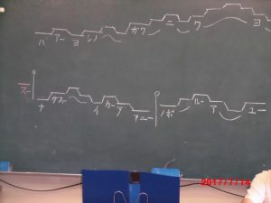 老人大学へ通いだして今年で15年目になる。ハーモニカは老大を3年で卒業してから、街の教室へ通いだして12年になる。民謡はいつまで続けられるかわからないが、寿命と追っかけっこするつもりでいる。川柳はもう川柳教のの信者なので辞めるわけにはいかない。民謡の今日の教材は「奈良県民謡の吉野筏流し唄」これは、「ながもの」と言って伴奏は尺八のみで唄う。「馬子唄」とか「音戸の船唄」「追分」のように概して作業唄が多い。民謡の先生がすごいと思うのは、黒板に山谷符号だけで譜面に似た節回しを、さらさら、よどみなく書かれる技は、まさに神業。尺八には譜面がある様だが、メロディは先生の頭の中にあるのみで、10回は10回同じメロディになるからすごい。写真はわかりにくいが、山谷を繋いだ、だけの譜面である。ついでに歌詞を1番だけ書いておく