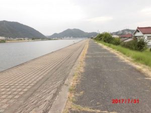 写真はウオーキングコースの川土手。夕立上がりの川土手は、上流から吹いてくる風が心地よかった。