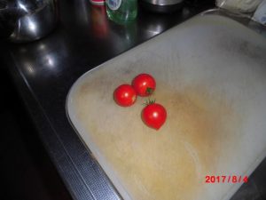 プランターに植えたトマトの収穫もそろそろおしまいになったが、買ったトマトとはとは比べものにならない、鮮やかな色をしている。今まで何回か朝の食卓を飾ってくれた。