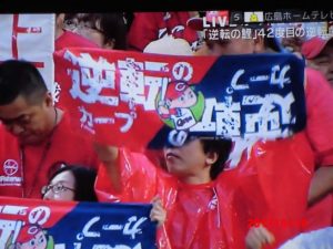 この写真は9/16日、この一戦を勝てばカープ優勝と言う、八回表の攻防をである。この時までは、スタンドを埋め尽くしたファンも、茶の間のテレビを見ていた人も、カープの優勝を疑う人はいなかったが、九回裏のエルドレッドの三振で、万事休す。優勝は明日以後に持ち越された。