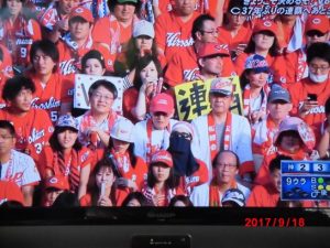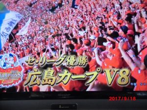 昨日は雨で地元での優勝は逃したが、今日は台風一過、天気も上々の甲子園で、カープはV8を果たした。決して花形選手はいない中での、連覇は、カープ選手ではないが、ファンも「最高で~す」と叫びたくなる。おまけに、中崎選手は、カープの選手の中で最初の2回目の抑え投手と言う勲章も手にした。今頃は広島の町は大騒ぎをしていることであろう。私たちも近所のお好み焼き屋の肝いりで26日に大判ふるまいをしてくれるので、カープ優勝祝賀会をやるので、ご相伴にあずかります。