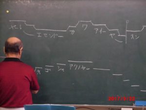 午後は老大の民謡教室。今日新しく習ったのは、「音戸の舟唄」このような歌を、先生は、「ながもの」と言われ、三味線の伴奏はなく、尺八一本の伴奏で唄うものらしい。その譜面は、山谷を繋いで、こぶしの一つもおろそかにできないようにできている。この譜面を、頭の中にあるのか、いとも簡単に書かれるのには驚きである。いつかテレビで、歌曲の名人戦の番組を見た時、上の譜面の様な横線に電流が走って、歌手の歌と、電流があっているかチェックしているのを見たことがあるが、五線譜よりも厳しく出来るのか、譜面ではなく、電流の走るのを使っていた。そのことを思うと、民謡は電流こそ使わないが、先生の頭の中だけで生徒の歌にチェックを入れる技は神業と言わなければならない。