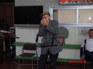 月に1回程度のペースで、デーケアへボランティアに行っているが、ここが一番楽しい。というのはこちらが準備していった曲よりも、マイクを持った人が立ち上がって、自分で曲をリクエストして吹いてくれと言われる、何が出るかわからないが、まさかベートンベンや、シューベルトは出ないと思って演歌や軍歌、童謡などに答えている。これには緊張感があってこちらも面白くなって、お互い盛り上がる。今回は私が山茶花の宿のリクエストに応え熱を入れて演奏をしている。