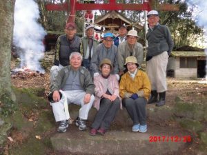 こちらは、稲荷さんの掃除部隊。石垣には文久のの文字が読めるが、あとはわからない。境内はイノシシが荒らして、一面掘り返した上に、銀杏の葉っぱが積もっていたのを、熊手でかき集め、たき火で燃やし片づけるのであるが平生使わない筋肉を使うので、小休憩を取りながら時間までにはどうにか片付き、来年まで元気にと、記念写真をパチリ。煙は会長さんが、事前に消防署へ届出済だそうで心配はいらない。
