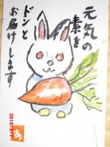 今日家内が絵手紙教室で、描いた帰った。自分では一生懸命に書いたのか、コメントが、「元気の素をドンとお届けします」と前向きである。」「元気の素」の「素」もユニークで面白い。偶然で去ろうが、17音で納まっているのも、家内としては上出来である。