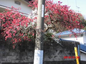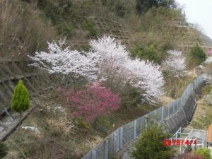 これは北側の道路から撮った、しだれ桃とこごめ桜。