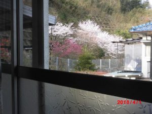 朝食を取りながら花見ができる幸せに、感謝している。これは1階の茶の間のテーブルから。