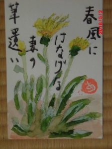 午後家内は20回目の絵手紙へ行って帰った。上の写真が今日の絵で下の絵は1回目の絵である。私が言うのもなんですが、はっきりと上達の後がわかる。1回目のおぼつかない筆遣いが今日の絵はのびのびした筆遣いが、上達の跡を表している。コメントは私が書いてやることにしているので、二人の合作である。