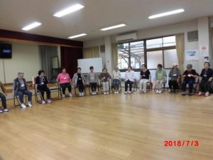 ラジオ体操の後は椅子に座ってできる、いろいろなストレッチや、指体操でする脳トレで、汗を流す。マンネリのようではあるが、家では中々続かない。程よい運動になるので、人気が良い。