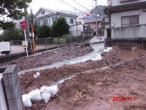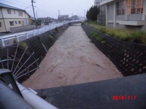 水路半分くらいの所を、濁流が流れていた。関係者はもう二、三時間避難を続けるように勧めたが、家内が楽にないと言うので、帰宅したが、家は何事もなく無事であった。