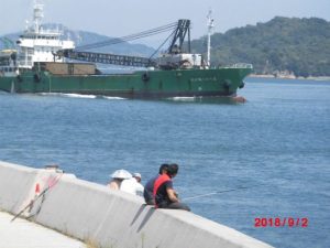 昼食は夕べのカレーの残り。それを食べて、海の見えるサウナへ行く。足腰を癒すのは、その時だけであるが、サウナが一番。1回10分程度のサウナ・水風呂を4回。それに塩湯・薬湯などを巡って1時間ほどで帰る。写真の積乱雲は、おそらく奥の方に夕立を降らせていると思う。のんびりと釣り竿を垂らしている間近を、砂運搬船が通って行った。砂船と言えば、、関空の盛り土はほとんどが、三原沖の海砂で、取り過ぎた為、護岸は崩れるし、魚はいなくなり、アマモは全滅だったが今頃やっと、高級魚のあこうが店頭に並ぶようになった。もちろん今でも海砂の採集は全面禁止になっていいる。